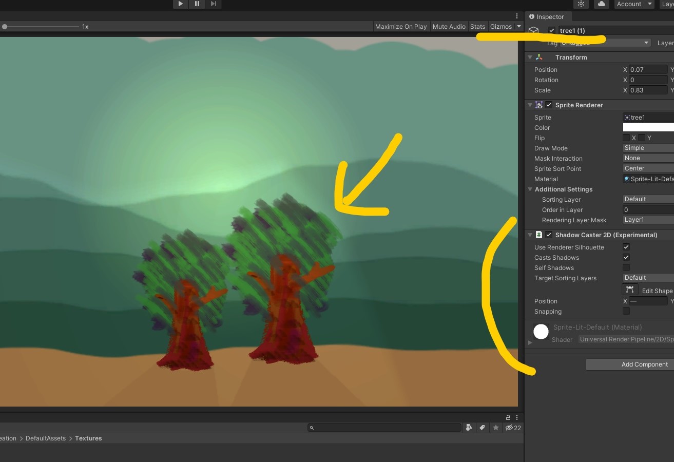 例1:オブジェクトにShadow Caster 2Dをつけて、かげをつける。ライトの方でShadowの設定があるので、そこで調整。